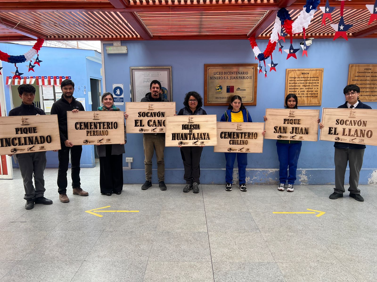 En el marco de las acciones para poner en valor el Asentamiento Minero San Agustín de Huantajaya, la Municipalidad de Alto Hospicio, a través de su Departamento de Turismo y Patrimonio, recibió una valiosa colaboración del Liceo Bicentenario Minero Juan Pablo II, que consistió en la elaboración de 8 señaléticas oficiales en madera para el sitio histórico.
